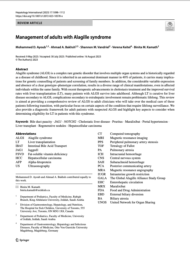 Alagille Syndrome (OMIM #118450) is a rare genetic pediatric cholestatic liver disease that can affect multiple organ systems of the body including the liver, heart, skeleton, eyes and kidneys. The specific symptoms and severity of Alagille syndrome can vary greatly from one person to another, even within the same family. Some individuals may have mild forms of the disorder while others may have more serious forms.